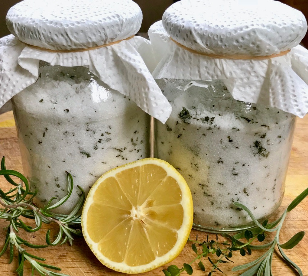 Basis für diese Mischungen ist 1kg naturbelassenes, unbehandeltes Steinsalz aus Deutschland. Ohne Jod, ohne Fluorid, ohne Rieselhilfen. Ich habe Rosmarin, zwei Sorten Thymian, etwas Lavendel (Blätter – die kann man auch verwenden) und Salbei verwendet. Ein Glas enthält noch zusätzlich zweierlei Basilikum. Die Mengen gebe ich nach Gefühl hinzu. Die Kräuter kommen natürlich aus dem eigenen Anbau. Über das Salz habe ich den Saft einer halben Zitrone geträufelt und gut durchgemischt. Vor dem Abfüllen sollte das Ganze über Nacht trocknen, das reicht. Fertig ist das Salz und es ist einfach lecker aromatisch!